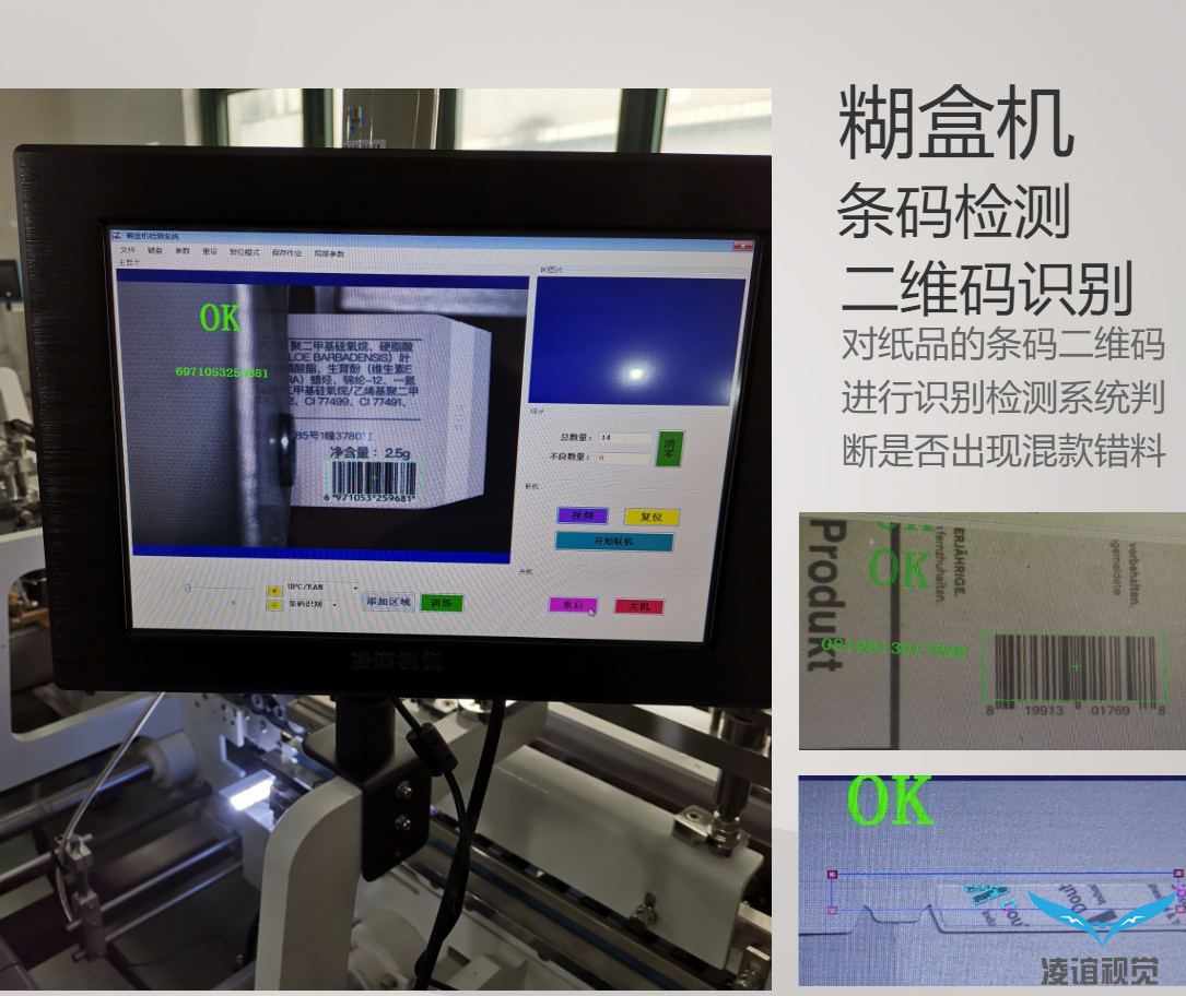 通常包裝廠生產(chǎn)的紙盒產(chǎn)品在出廠交貨前一道工序為粘盒,凌誼視覺提供的糊盒機(jī)防混貨檢測系統(tǒng)是加裝在糊盒機(jī)臺上實現(xiàn)在線檢測,防止粘盒混貨,識別條碼防呆,保障產(chǎn)品出貨品質(zhì)。該粘盒防混貨檢測系統(tǒng)基于CCD機(jī)器視覺識別技術(shù),采用高速進(jìn)口工業(yè)相機(jī)設(shè)備,通過高速反應(yīng)的光電感應(yīng)觸發(fā),對每一個包裝盒子上的圖文、條碼、料號信息識別實時傳輸給由我公司自主研發(fā)的凌誼視覺檢測系統(tǒng),由視覺檢測系統(tǒng)進(jìn)行數(shù)據(jù)對比校驗后判斷是否存在混貨串貨的情況,當(dāng)檢測到混貨產(chǎn)品時,系統(tǒng)實時進(jìn)行聲光報警同時由停機(jī)模塊輸出停機(jī)信號控制糊盒機(jī)停機(jī),把混貨產(chǎn)品停在相對固定的位置,方便查找和取出。